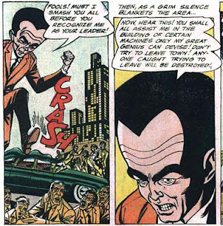 As for his superhero costume, J'onn is the gentle giant of the Justice League. His costume should represent that. He shouldn't look angry or distant or emo or too alien--in post-Crisis continuity he choose his traditional look as an amalgam of his true Martian form and what humans expected Martians too look like. (Pre-Crisis, well, that's what Martians looked like and how they dressed.) The Martian Manhunter should never look pissed off unless he has a REALLY GOOD reason to be, and that coneheaded guy up there looks like he'd rip your lungs out if you so much as looked at him crossed-eyed. I suspect that's why he's reaching out like that....